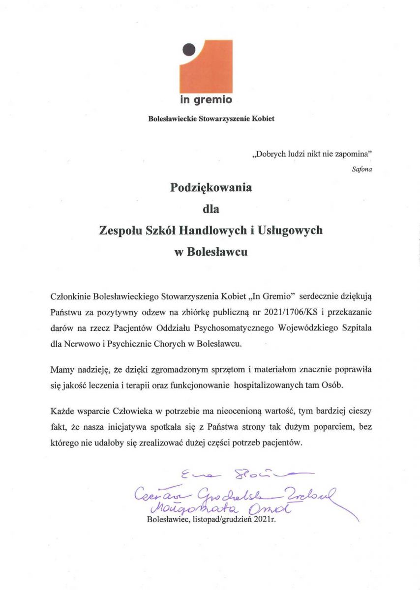 Członkinie Bolesławieckiego Stowarzyszenia Kobiet „In Gremio” serdecznie dziękują uczniom ZSHiU