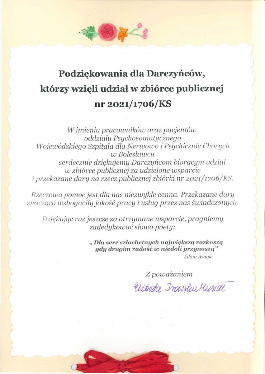 Członkinie Bolesławieckiego Stowarzyszenia Kobiet „In Gremio” serdecznie dziękują Państwu za pozytywny odzew na zbiórkę publiczną nr 2021/1706/KS i przekazanie darów na rzecz Pacjentów Oddziału Psychosomatycznego Wojewódzkiego Szpitala dla Nerwowo i Psychicznie Chorych w Bolesławcu.