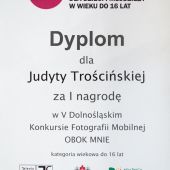 Już po raz 5 odbył się Dolnośląski Konkurs Fotografii Mobilnej Obok mnie”. 7 marca br. zostały wręczone nagrody najbardziej utalentowanym uczestnikom. I miejsce w kategorii 14 – 16 lat za fotografię „Szczęście” otrzymała Judyta Trościńska z Zespołu Szkół Handlowych i Usługowych im. Jana Kochanowskiego w Bolesławcu, którą merytorycznie przygotował nauczyciel zawodu – Grzegorz Matoryn.
