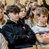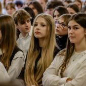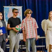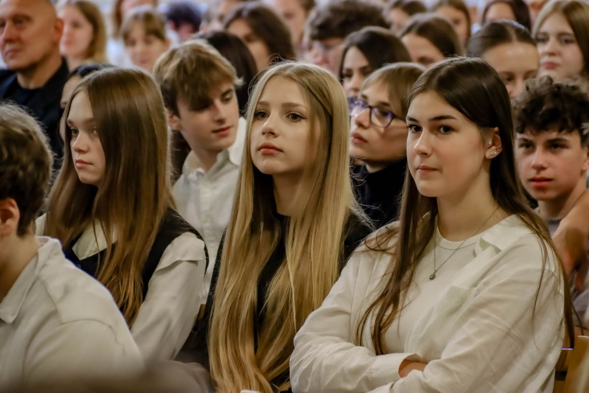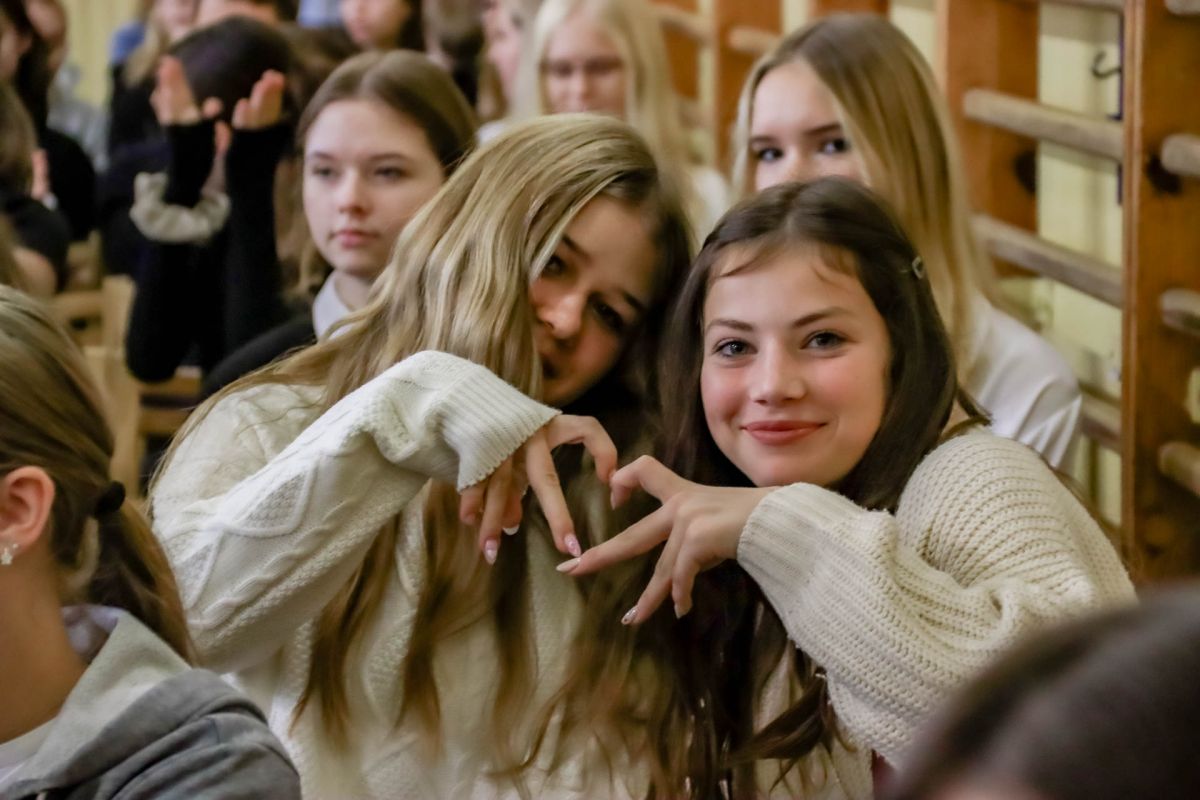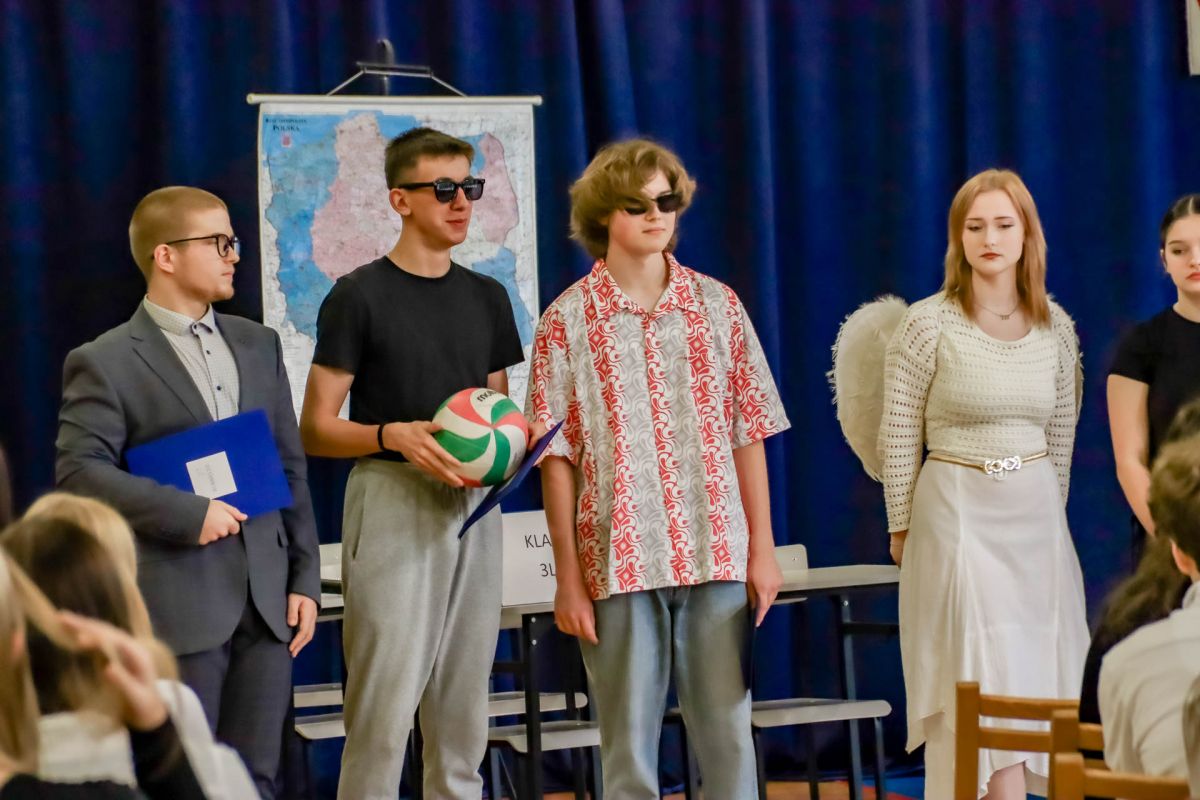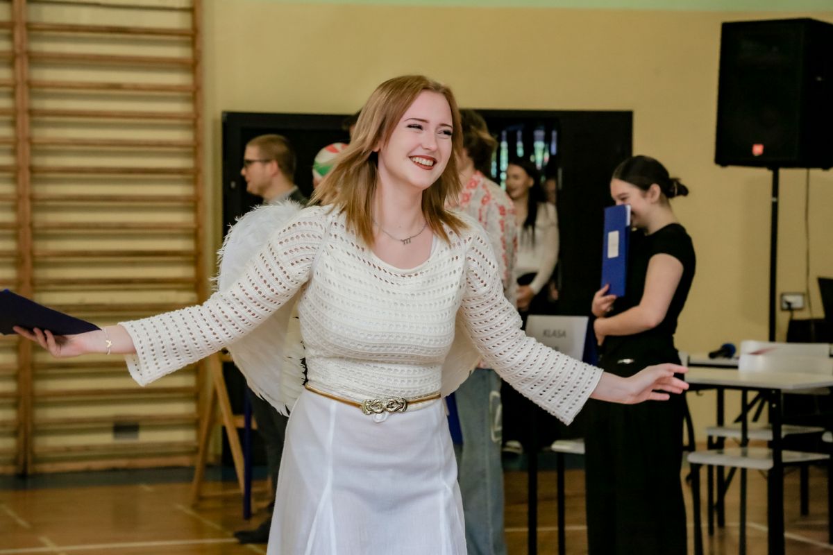 Świąteczny apel przygotowała kl. 3LB wraz z wychowawczynią, Agnieszką Koplin. Wraz z życzeniami Uczennice i Uczniowie przygotowali program artystyczny, którego celem było spojrzenie na uczniów i nauczycieli z przymrużeniem oka.