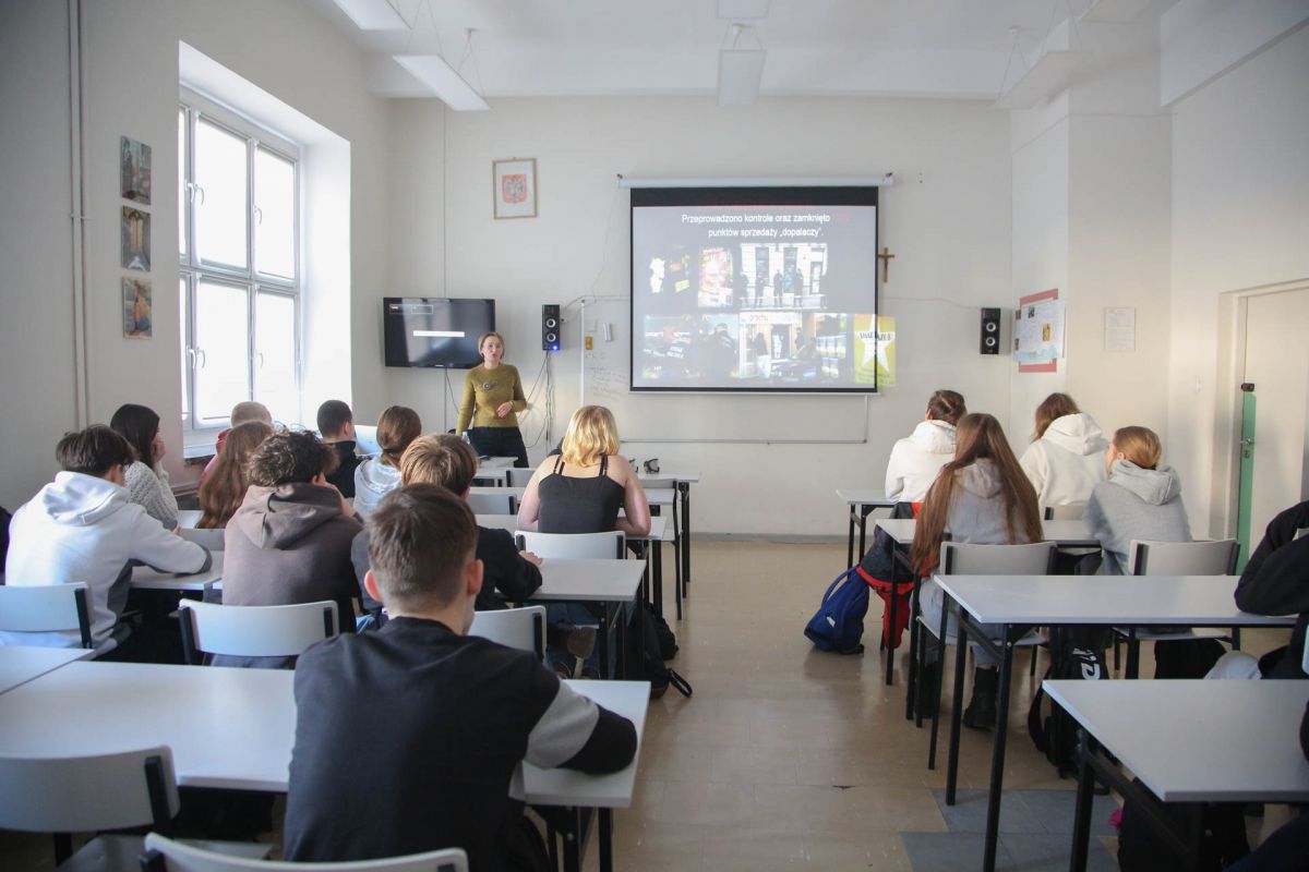 W poniedziałek 18 lutego klasy pierwsze technikum uczestniczyły w prelekcji przeprowadzonej przez pracownicę Sanepidu, panią Kamilą Kołakowską na temat współczesnych uzależnień młodzieży, ich wpływu na zachowania i sposobów radzenia sobie z nimi.