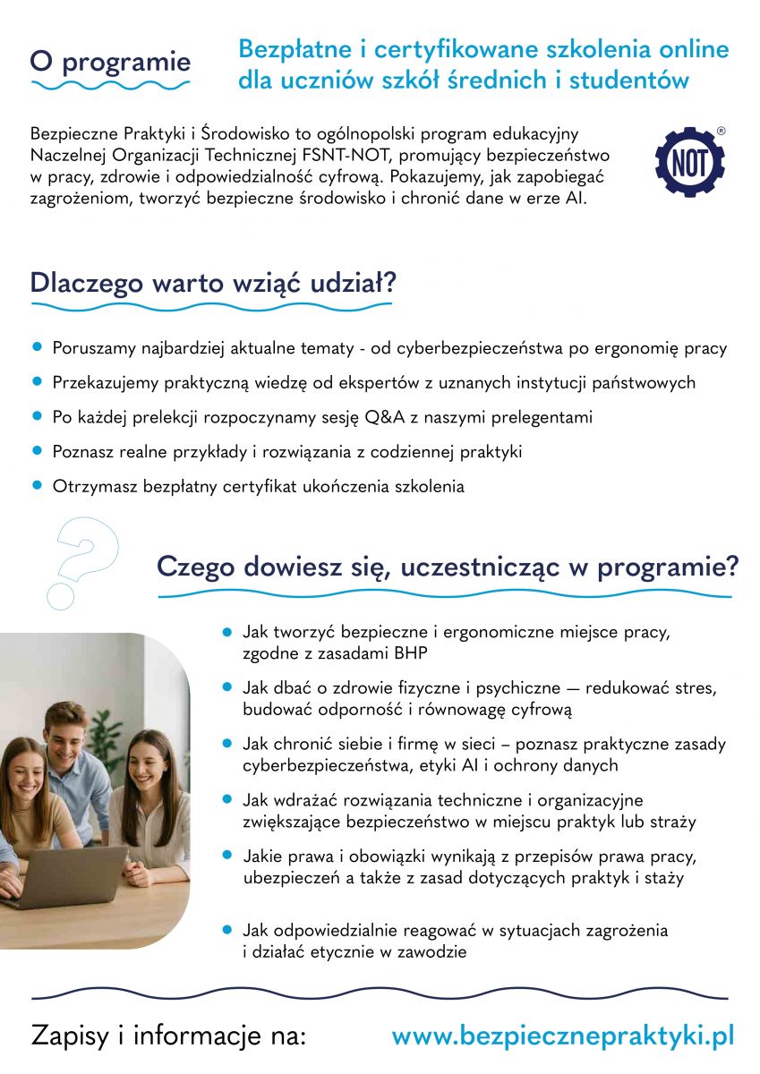 W dniach 10-11.12.2025 uczniowie klas 3W i 3F wzięli udział w szkoleniu online, na którym poruszane były najważniejsze zagadnienia od cyberbezpieczeństwa po ergonomię pracy.