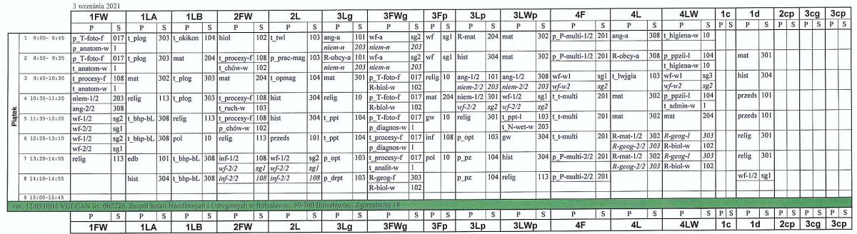 Plan lekcji na pierwsze 2 dni roku szkolnego 2021/2022.