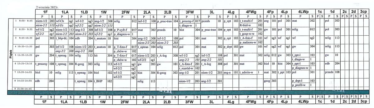 W załączniku znajduje się plan zajęć lekcyjnych obowiązujący w piątek.