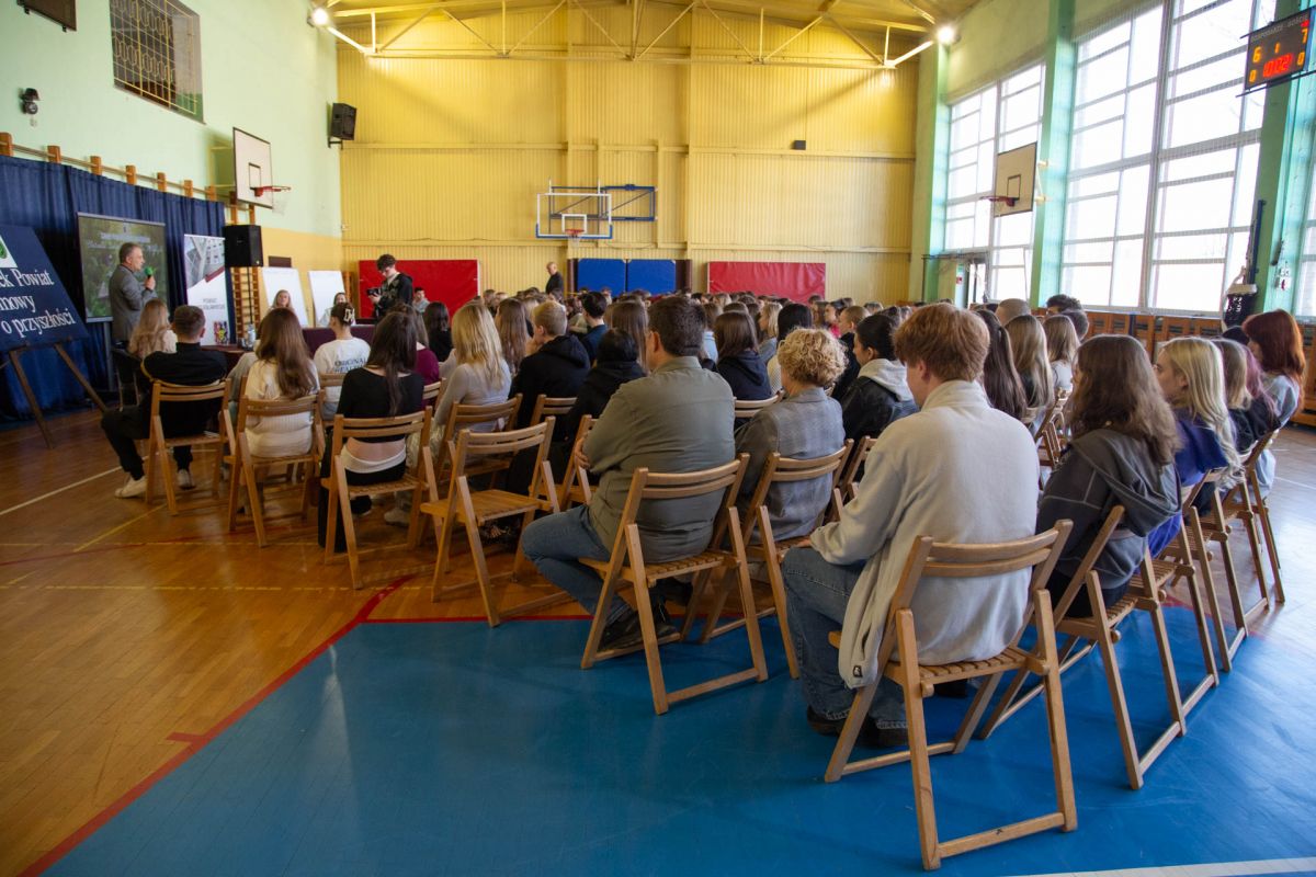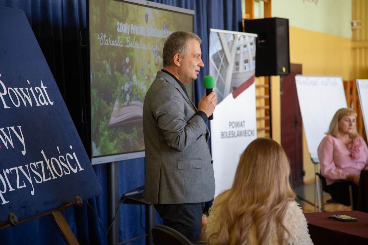 W dniu 27 marca 2026r. uczniowie klas trzecich, czwartych i piątych Zespołu Szkół Technicznych i Przyrodniczych w Bolesławcu wzięli udział w spotkaniu z Panem Tomaszem Gabrysiakiem, Starostą Bolesławieckim oraz z panią Katarzyną Ziębą, Naczelnik Edukacji, Kultury i Sportu.