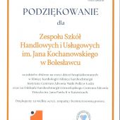 Uczennice  i  uczniowie  Zespołu Szkół Handlowych i Usługowych im. Jana Kochanowskiego wzięli udział w akcji charytatywnej na rzecz podopiecznych Zakładu Opiekuńczo – Leczniczego nr 9 Wojewódzkiego Szpitala dla Nerwowo i Psychicznie Chorych w Bolesławcu prowadzonej przez Członkinie Bolesławieckiego...
