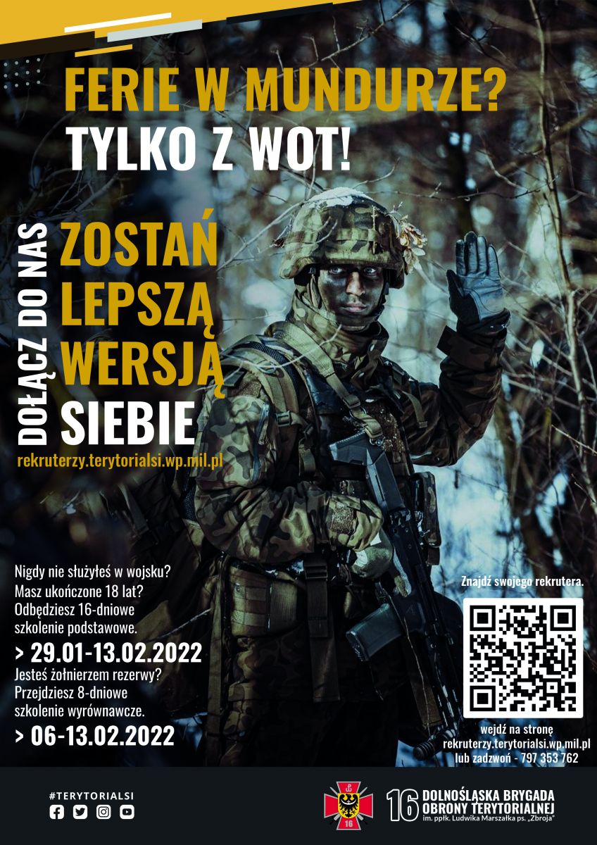 w dniach 29 stycznia – 13 lutego 2022 r. 16 Dolnośląska Brygada Obrony Terytorialnej realizować będzie projekt „FERIE z WOT”.
