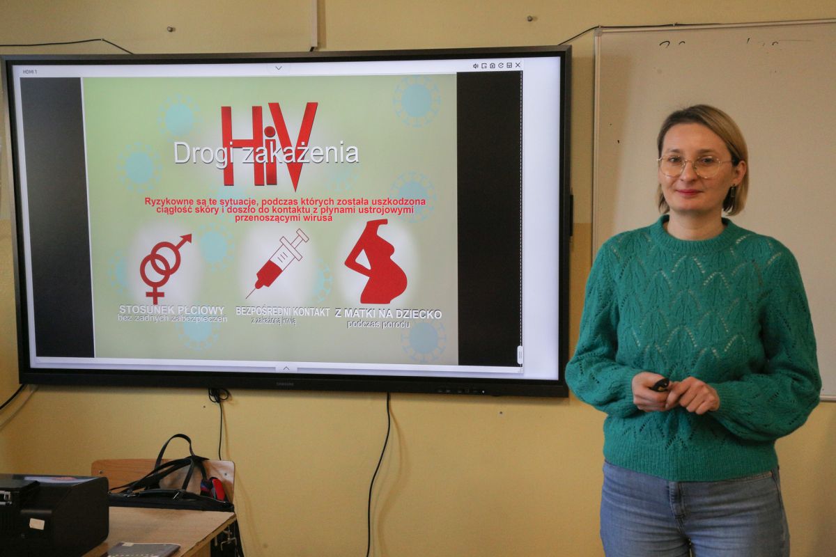 29 i 30 stycznia 2023 r. uczniowie wszystkich klas czwartych technikum oraz trzeciej szkoły branżowej uczestniczyli w prelekcji „Profilaktyka HIV/AIDS”. Prelegentka, pani Kamila Kołakowska z bolesławieckiego Sanepidu, przekazała młodzieży cenne informacje dotyczące ww. tematu. W swojej wypowiedzi skupiła się na przyczynach zakażenia wirusem HIV, rozwoju wirusa HIV w organizmie człowieka, fazach przebiegu zakażenia i rozwoju choroby. Omówiła historię pandemii HIV i zwróciła uwagę na rozwój innych chorób wenerycznych .