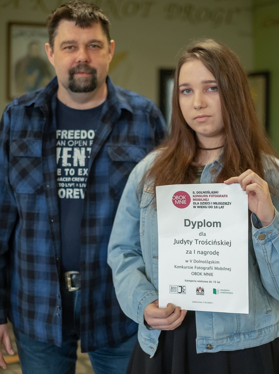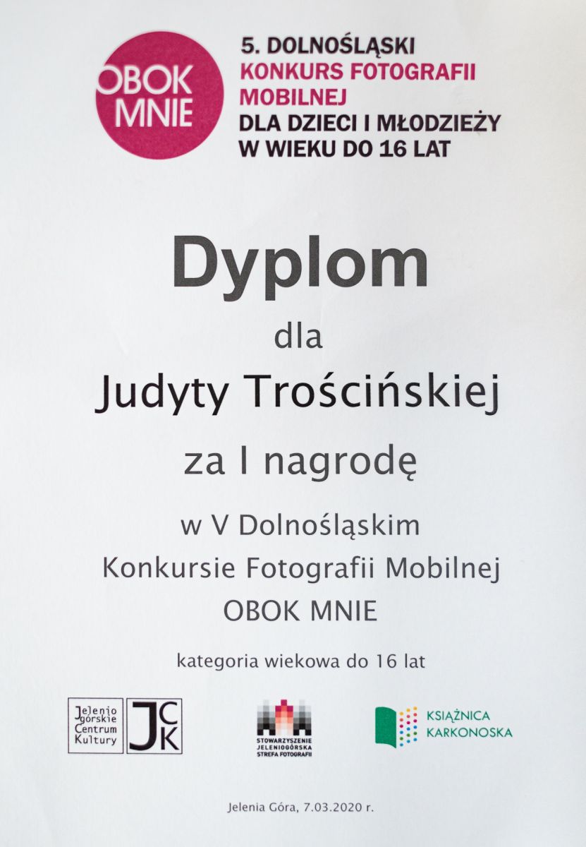 Już po raz 5 odbył się Dolnośląski Konkurs Fotografii Mobilnej Obok mnie”. 7 marca br. zostały wręczone nagrody najbardziej utalentowanym uczestnikom. I miejsce w kategorii 14 – 16 lat za fotografię „Szczęście” otrzymała Judyta Trościńska z Zespołu Szkół Handlowych i Usługowych im. Jana Kochanowskiego w Bolesławcu, którą merytorycznie przygotował nauczyciel zawodu – Grzegorz Matoryn.