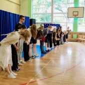 Świąteczny apel przygotowała kl. 3LB wraz z wychowawczynią, Agnieszką Koplin. Wraz z życzeniami Uczennice i Uczniowie przygotowali program artystyczny, którego celem było spojrzenie na uczniów i nauczycieli z przymrużeniem oka.