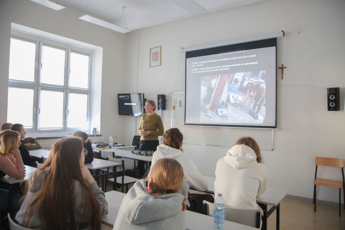W poniedziałek 18 lutego klasy pierwsze technikum uczestniczyły w prelekcji przeprowadzonej przez pracownicę Sanepidu, panią Kamilą Kołakowską na temat współczesnych uzależnień młodzieży, ich wpływu na zachowania i sposobów radzenia sobie z nimi.
